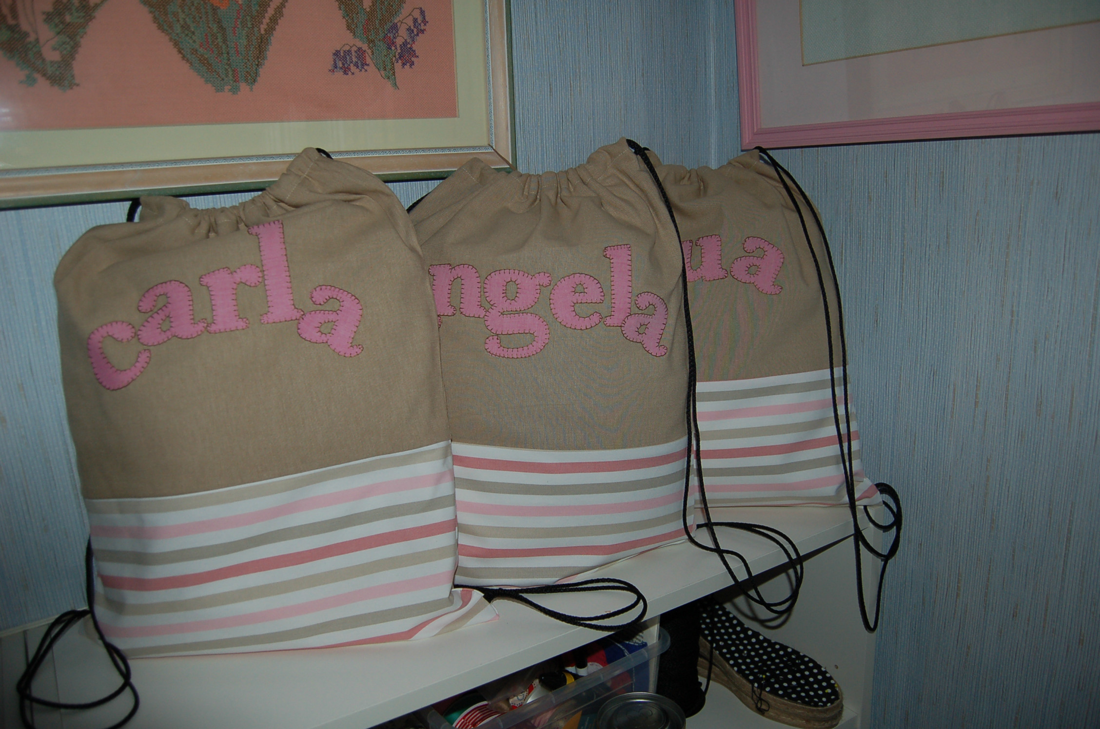 Terminadas tres bolsas que me han encargado , son bolsas de cordones, en dos telas diferentes , una con rayas de tres colores y la otra una tela lisa en tostado muy bonitas , con el nombre aplicado a punto festón . Espero les guste a las tres nenas . gracias Alicia .